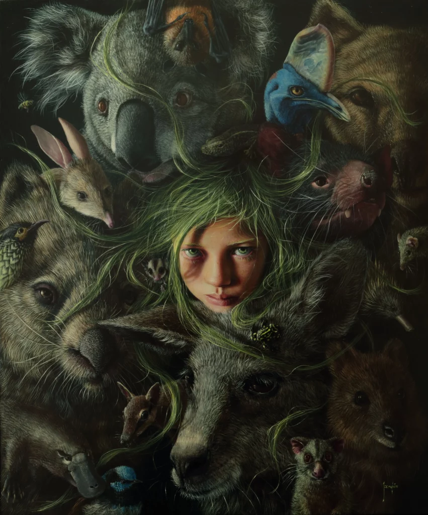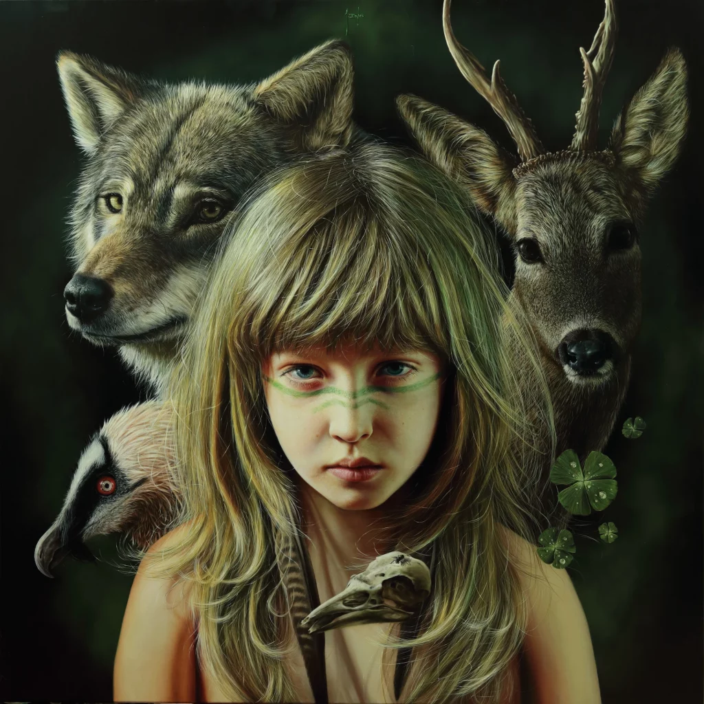 When my daughter Lara was born, I felt truly blessed to see that she would grow up in the natural environment we live in: a solitary house next to the mountains, surrounded by all the animal species depicted in the painting, roaming around our home. It’s a place I would have always wanted to grow up in myself.