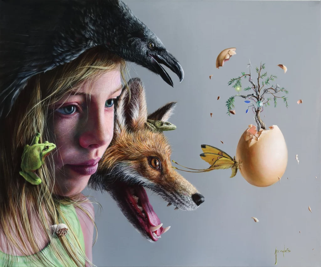 That’s one of the most frequent questions I get. People always want to know the number of hours. But it really depends on the size of the work and the number of elements in it. For example, to paint the fox in the painting, I had to do it hair by hair, then apply layers of glaze, and I can repeat that process up to five times.