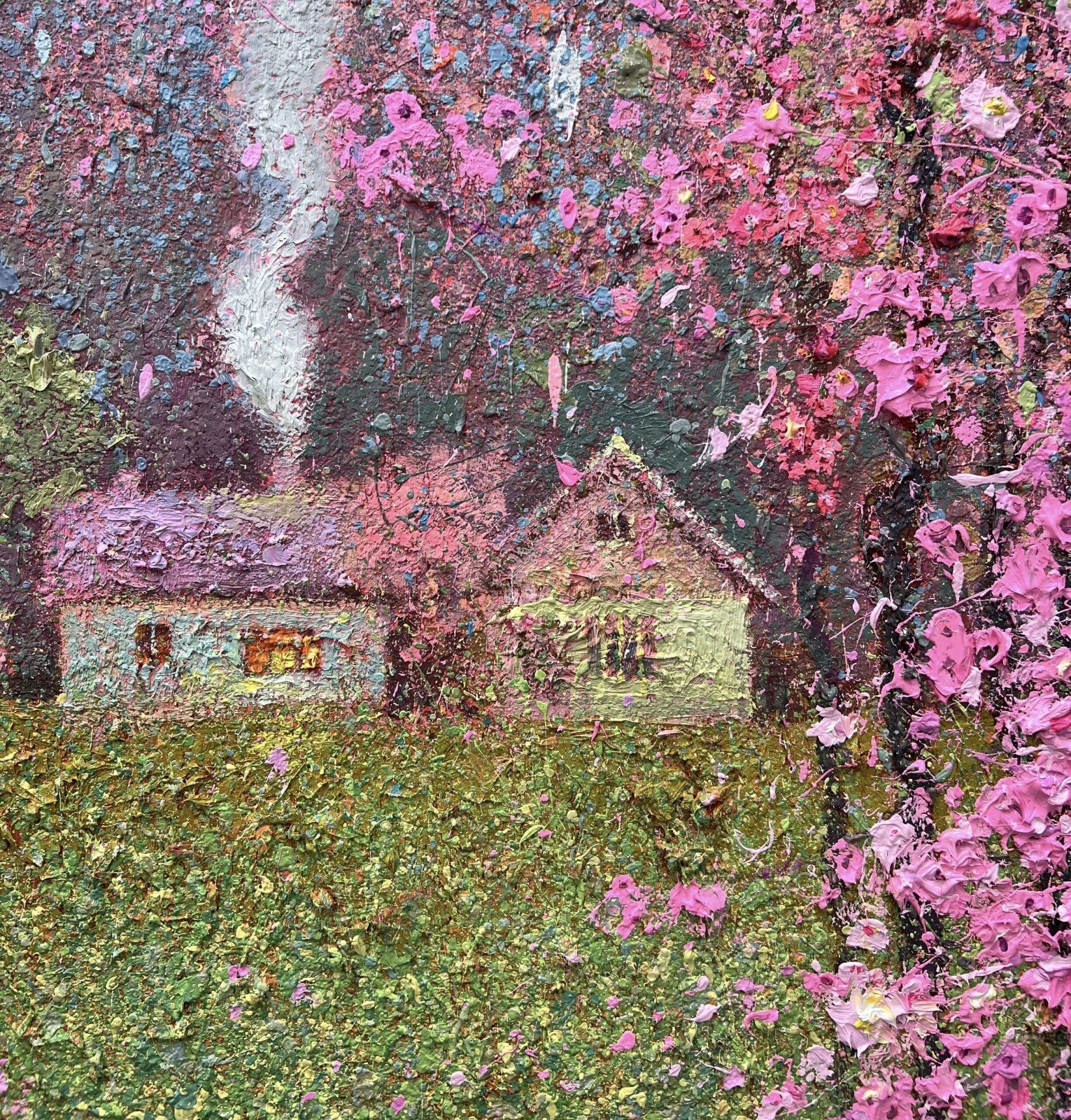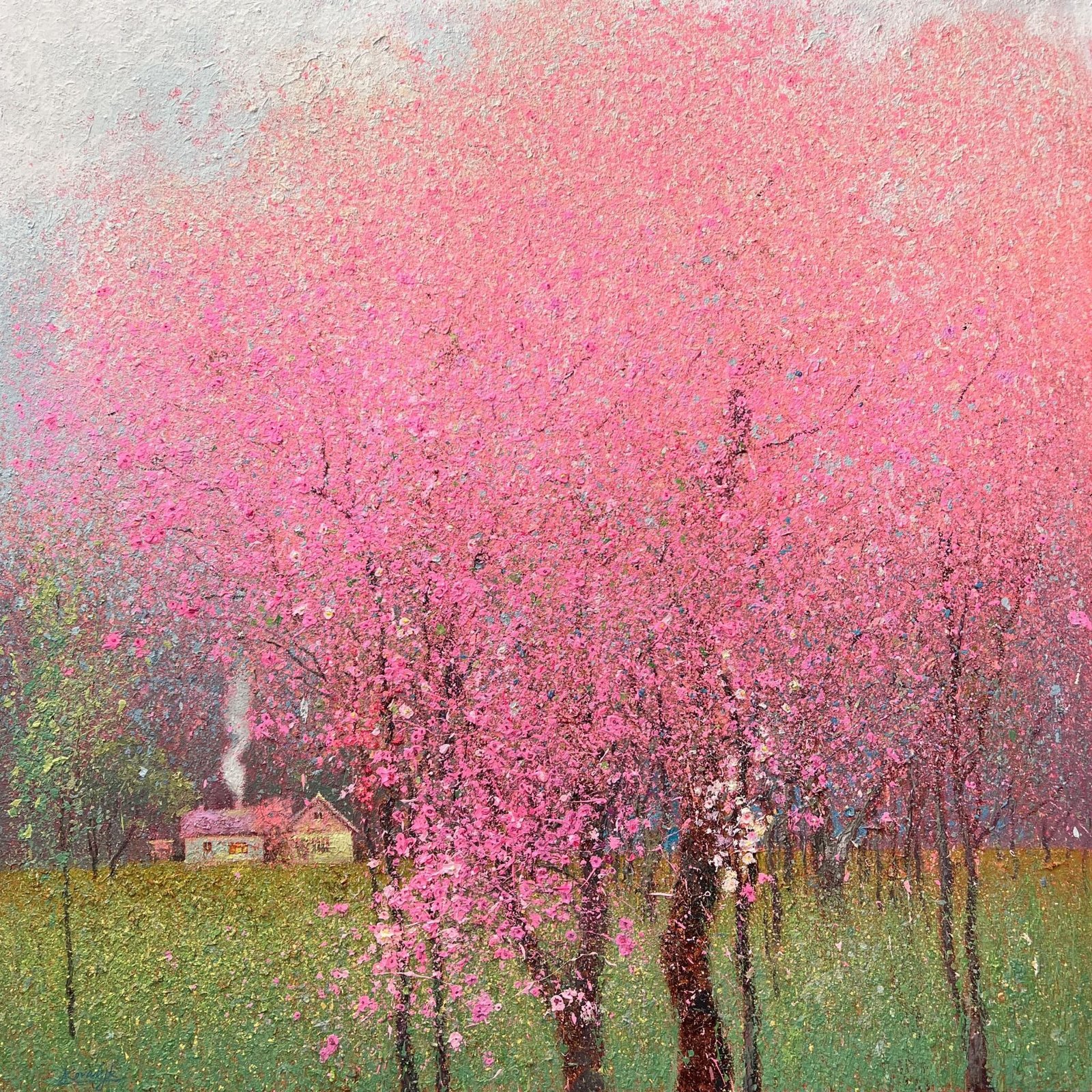 BJR: Take “Energy of Spring” by Kovalyk. The Visual Poetry lies in the blooming cherry trees—which bring joy through an ancestral instinct for abundance—and the chimney smoke, which evokes warmth and nostalgia. But what’s revolutionary is its Visual Music: the pink patches gradate like notes in a musical scale, the grey rectangles (sky/smoke) create rhythm, and the branches form an “organic calligraphy” that we discover as we explore the painting. That abstract layer is what creates a lasting emotional impact.